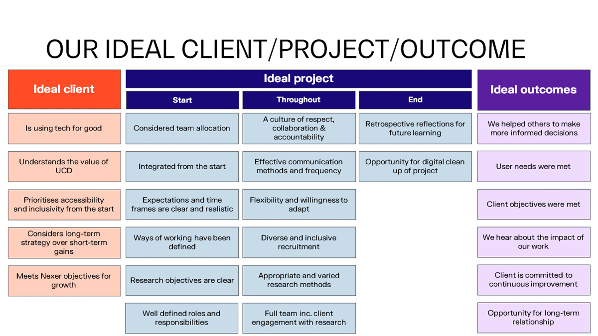 - All teams describing their ideal client and project, for example this from our research team, followed by our service design team future-casting to a YouTube interview in 2028, where they talk about their work to connect communities and reduce health inequalities through focusing on transport